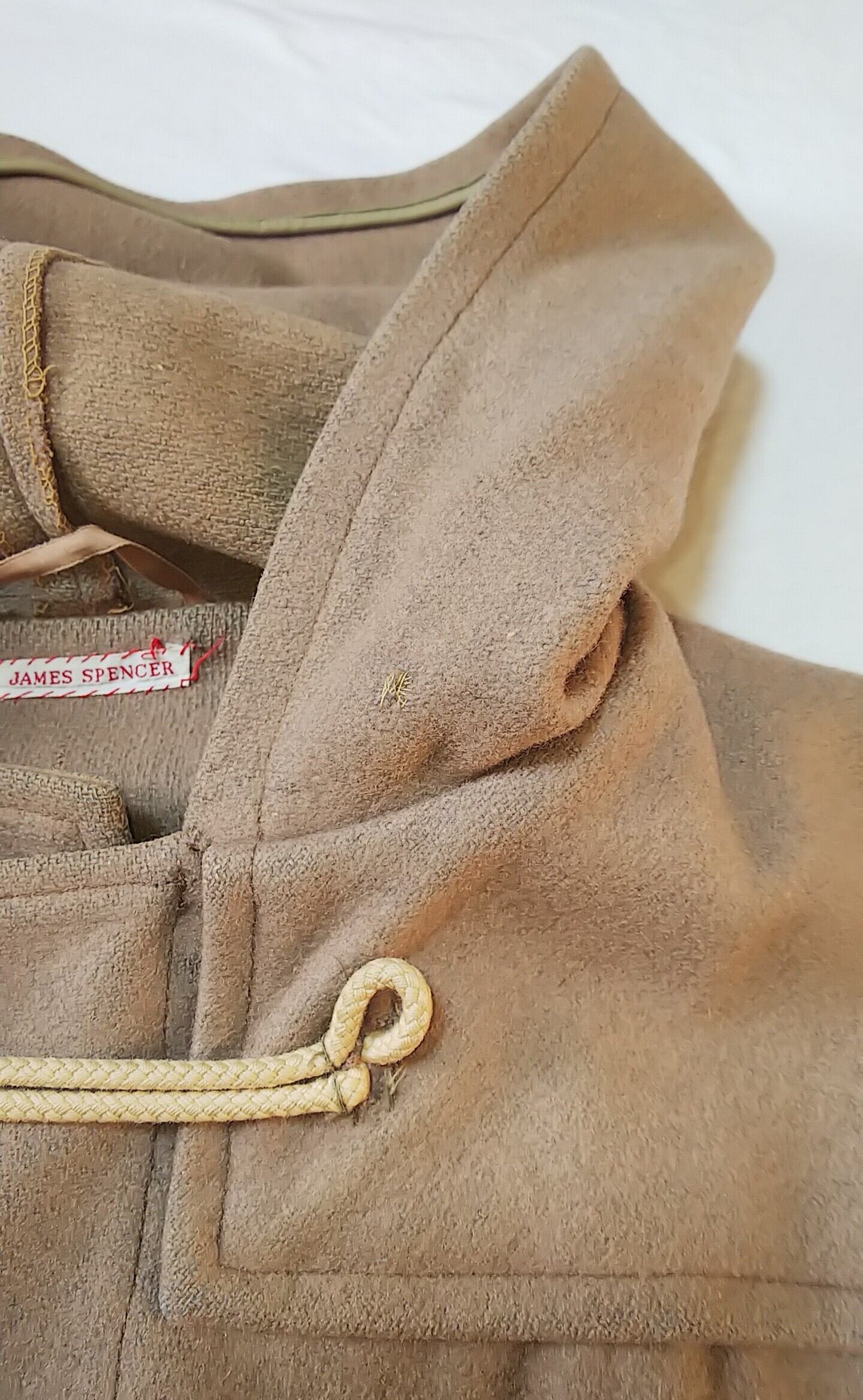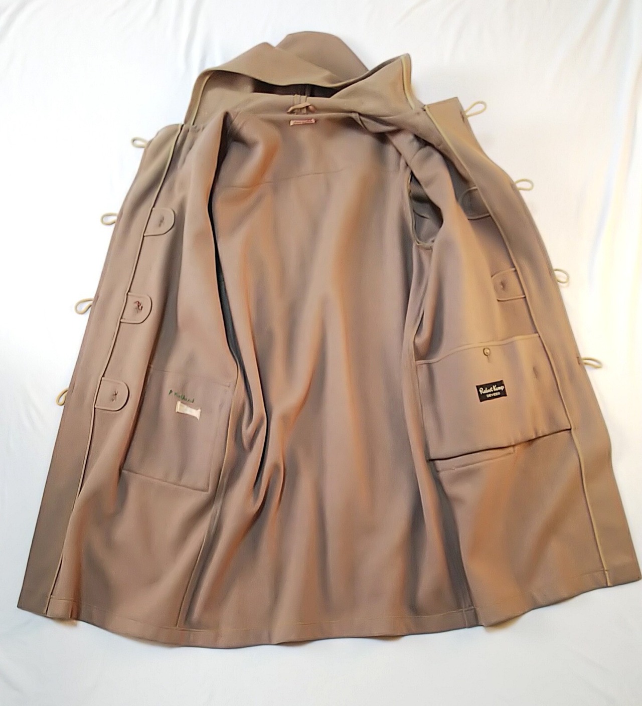 ダブルトグルなのが特徴的です。生地はベージュにブルーが混ざった珍しい物です。