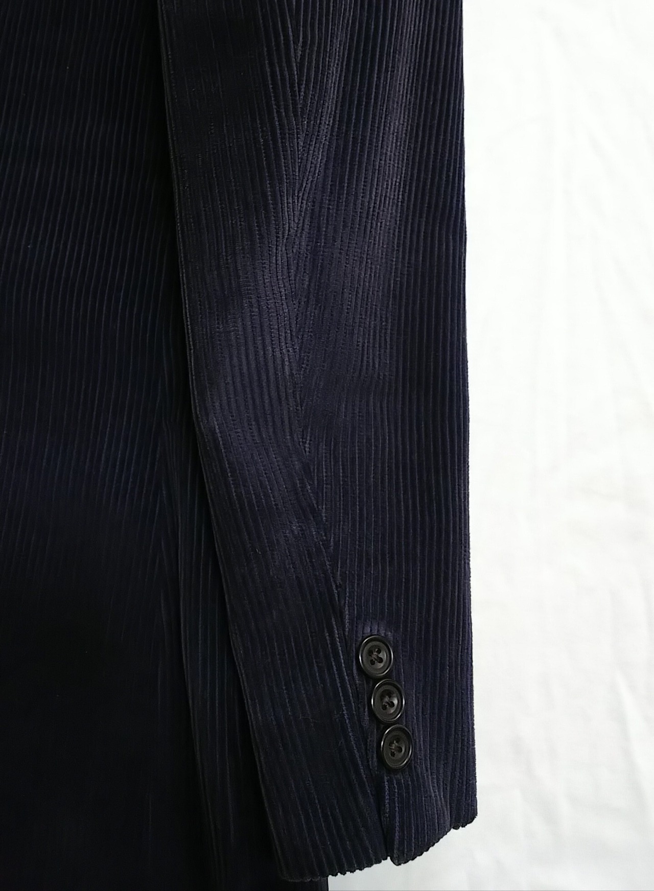 裾に向かって細くなるシルエットが美しい、1970年代アクアスキュータムのコーデュロイテーラードジャケットです。大人の上品さを演出する、ネイビーカラーがベースの一枚。裏地もデザインもこだわり抜いたジャケットは、オンオフ問わず大活躍間違い無しです。
